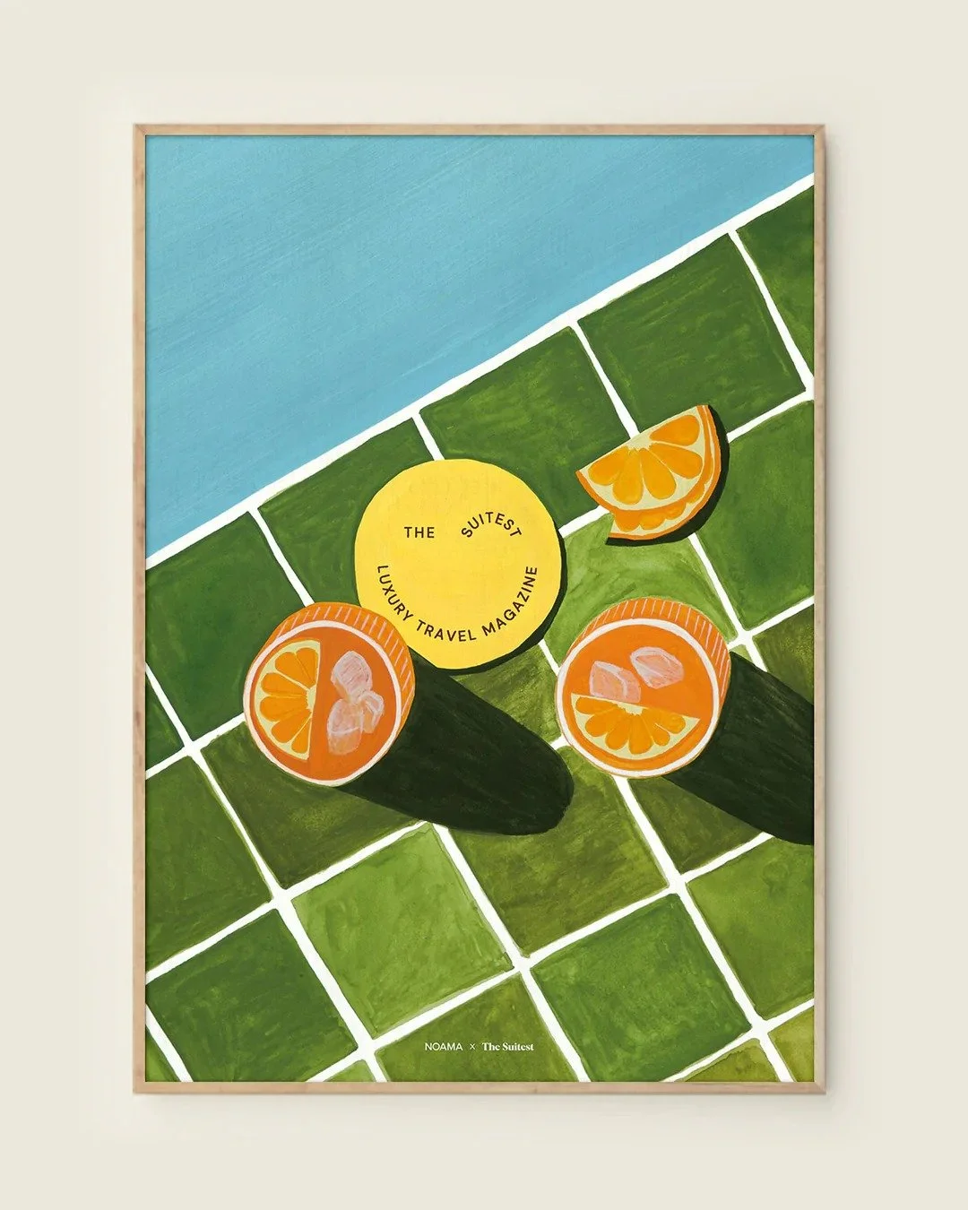 Inspired by one of our logos, Noama and The Suitest imagined this sunny poolside flatlay. Featuring punchy drinks with slices of orange against a turquoise pool and green tiles, our bright coaster smiles back at you and invites you into the scene.
